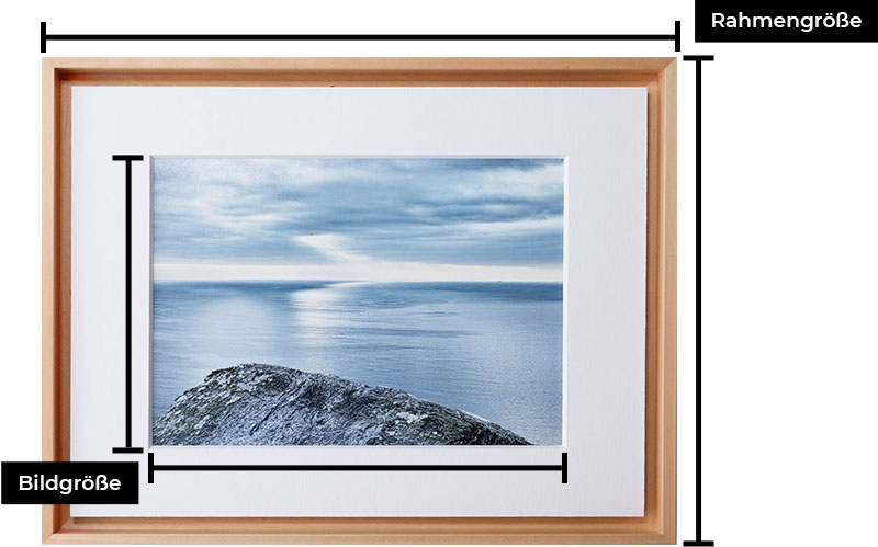 Sie finden unten die Größe des Rahmens, sowie die Größe des darin (mit Passepartout) gerahmten Bildes. Andere Masse sind auf Wunsch möglich, fragen Sie diese bitte im letzten Schritt über das Kontaktfeld an.